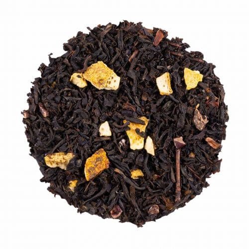 Té negro Ceylon y Sudíndico, piel de naranja (3 %), chocolate (azúcar, pasta de cacao, manteca de cacao, emulgente: lecitina) y aroma natural.